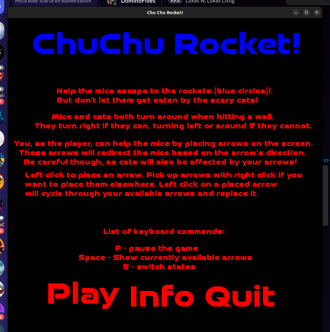 In this project we had the task of creating a 2D arcade game. Me and my partner decided to go with making a clone of the GBA cult classic puzzle game Chu-Chu Rocket! In this game, the player helps mice escape from some real mean cats, by placing arrows to strategically redirect the mice to the goal. It's not easy though, as there are many obstacles on their journey. Not only that placed arrows redirect cats as well! It was a hard but very rewarding project, giving me lots of experience with C++, OOP, Git feature branching, the SFML interface, use of pointers and smart pointers, and memory management.